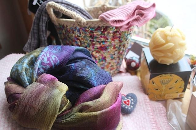 グリーンとホワイトが基調の可愛らしい外見のお店で、中に入るとお洋服からスカーフ、ぬいぐるみ、本、毛糸、地元作家さんの木製おもちゃなど様々な雑貨が所狭しと並んでいます。